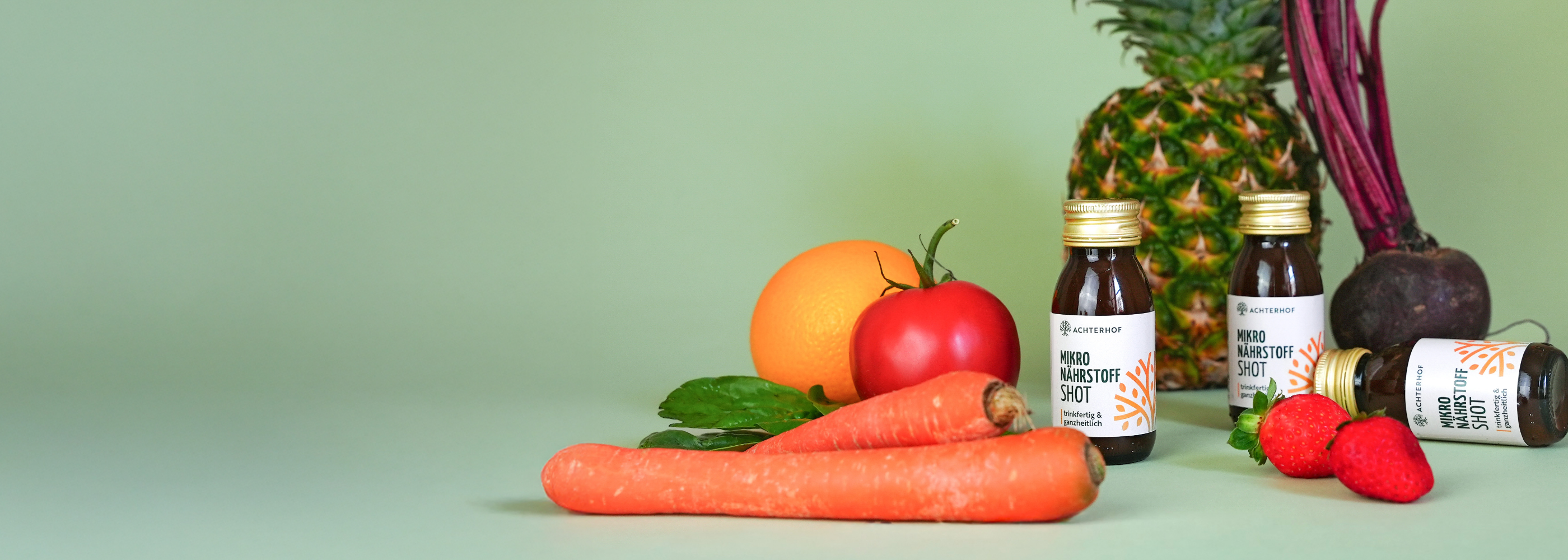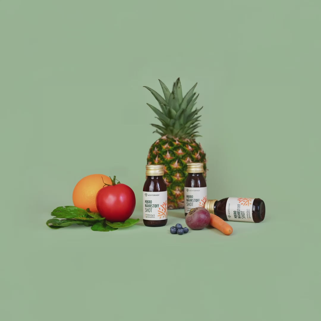 Ob am Morgen für einen vitalen Start, als gesunder Boost im stressigen Alltag oder zur täglichen Unterstützung deines Körpers – der Mikronährstoff Shot ist dein unkomplizierter Begleiter für mehr Wohlbefinden und Energie.2 Deine tägliche Portion Gesundheit.1 Ohne Aufwand. Ohne Kompromisse.